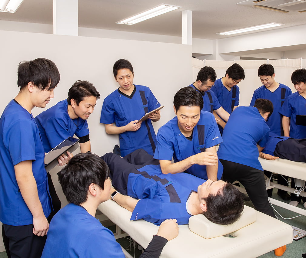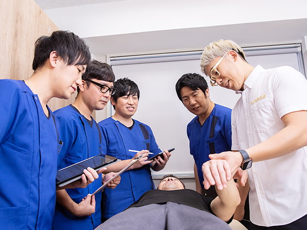 入社した先輩理学療法士の全員が、この念入りな教育に驚くと言います。その代表が、入社直後1カ月間に及ぶ導入教育であり、実践的施術トレーニングに加えて店舗営業の接客ノウハウにまで及び、22日間、一切業務は入らないのです。